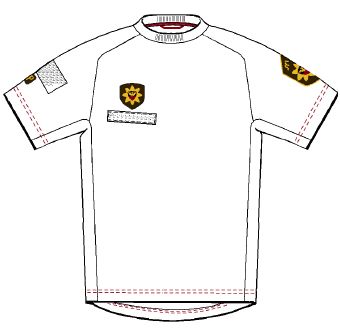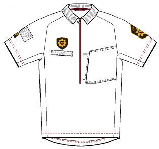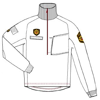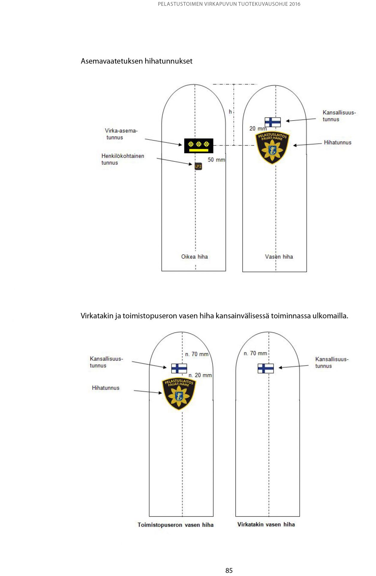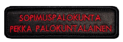 På skjortans, tröjans och rockens högra sida bör finnas en svart namnskylt med röd text Avtalsbrandkår eller Frivillig brandkår samt personens namn.