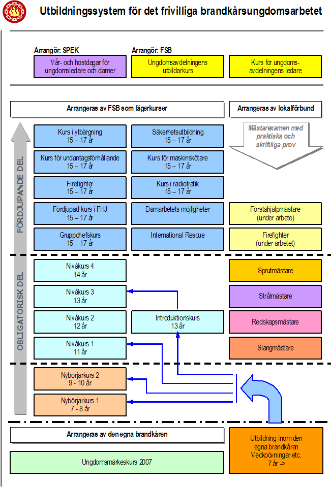 Kurssystemet för brandkårsungdomarna från 2008 är uppbyggt kring introduktionskurser, nivåkurser och fortbildningskurser. Som grund för brandkårsungdomarnas utbildning fungerar introduktionsutbildningen inom den egna brandkåren med veckoövningarna som det viktigaste momentet. Enligt nuvarande direktiv kan man påbörja sin brandkårsbana från 7 års ålder.