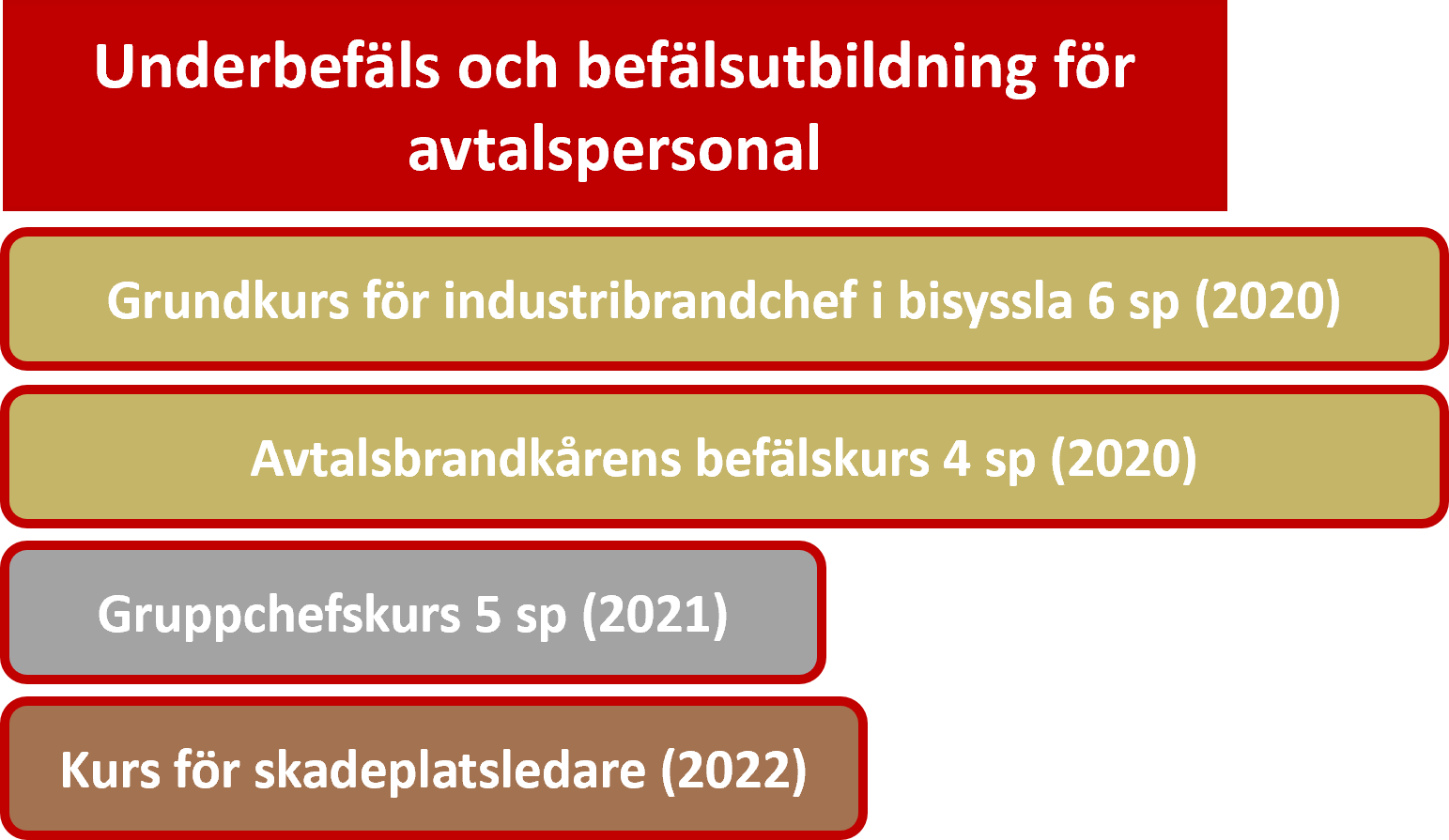 Utbildningen för avtalsbrandkårernas befäl omfattar fr.o.m. 2019 följande kurser: